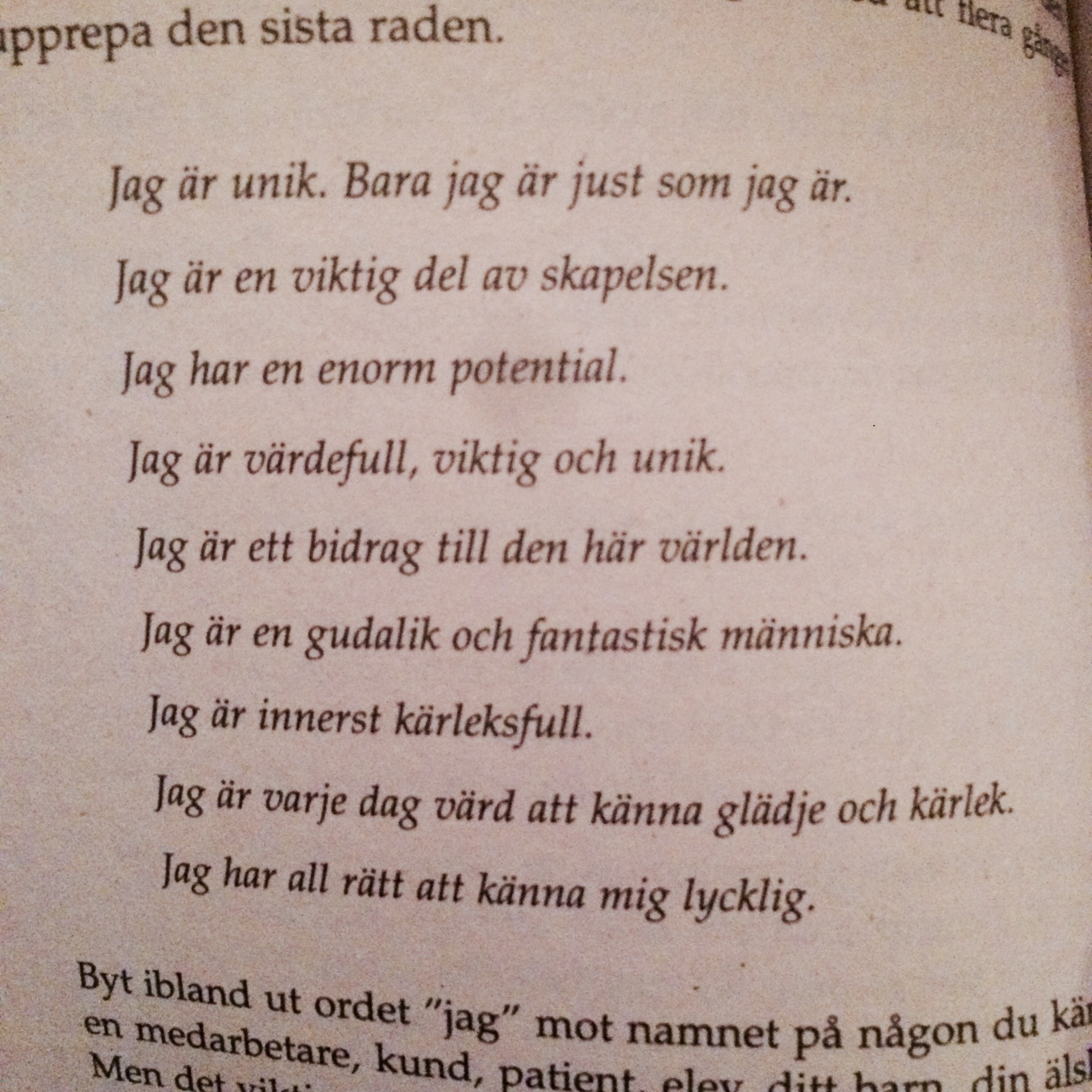 Jag är i grunden en positiv människa med en trygghet i mig själv. Men ibland kan man hamna på villovägar av olika skäl och då är det skönt att ha en sådan här peppbok tillhands, för att komma tillbaka i fas igen snabbt.