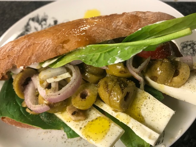 Sjukdag idag och fick ta det som fanns hemma. Älskar göra god macka med olja och lägga gojsiga saker på som grönsaker, oliver, avokado och sallad tex.